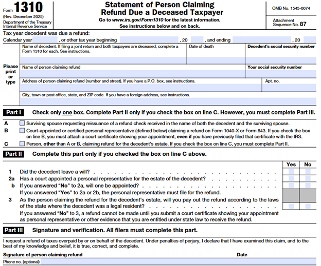4. Claiming a refund. If the 2025 federal income tax return shows a refund, IRS Form 1310 (see example below) or other documentation may be required depending on who files and signs the return.