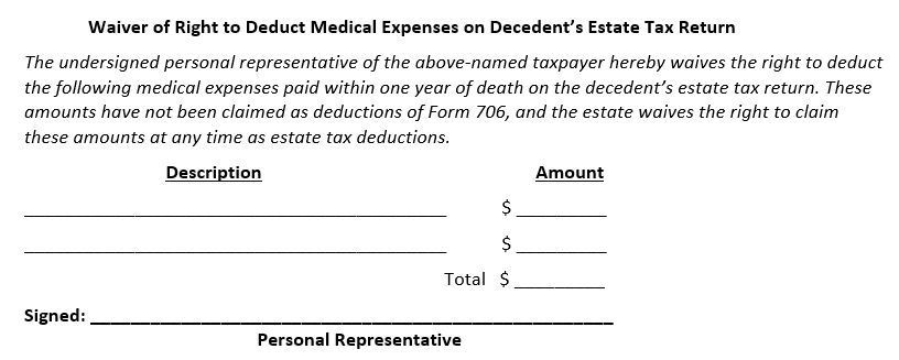 • Medical expenses. Medical costs paid from the decedent’s estate within one year of the day following death can be deducted either on Schedule A of the decedent’s Form 1040 or on the decedent’s Federal Estate Tax Return (IRS Form 706). If medical costs are deducted on the decedent’s Form 1040, they are deducted in the year incurred, either on the decedent’s final Form 1040 or by filing an amending Form 1040 from a prior year (Form 1040-X) and are subject to the 7.5 percent of adjusted gross income threshold. If the expenses are claimed on either Form 1040 or Form 1040-X, a waiver listing the expenses must be attached in duplicate to either return. The waiver is irrevocable. The statement is required even if the estate is not required to file IRS Form 706. The following is a sample waiver statement: